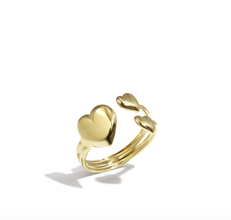 Ringens öppna siluett omfamnar fingret med tre hjärtan i olika storlekar: ett stort, glänsande hjärta placerar sig elegant på ena sidan, medan två mindre och mer sofistikerade hjärtan skapar perfekt balans på den motsatta sidan.